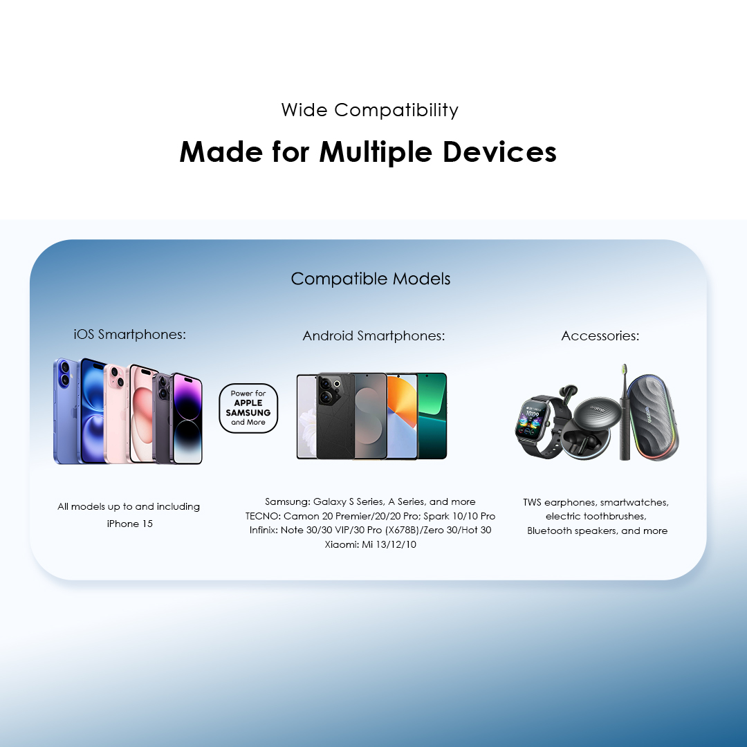 With one Type‑C port and two USB‑A ports, PowerFlow L1 charges up to three devices at the same time, delivering a total output of up to 15W for smooth, efficient everyday charging.